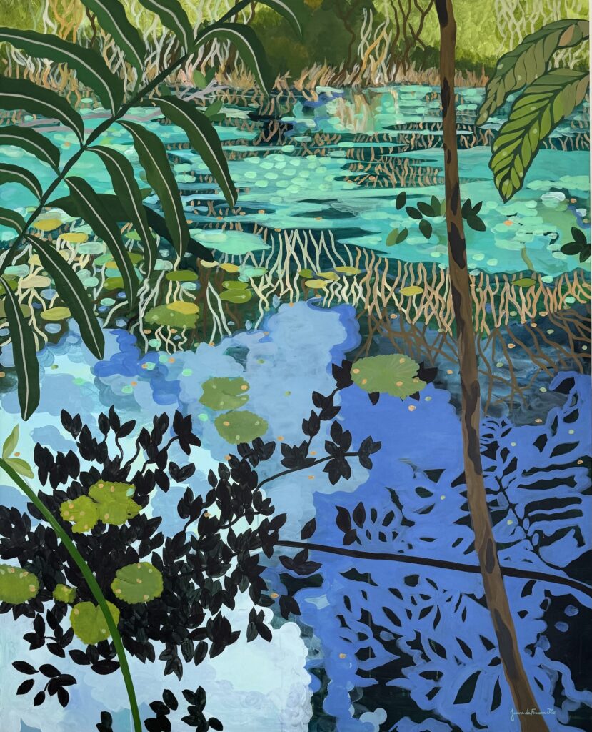 By using brilliant chroma and going beyond the perceived forms, she generates landscapes and scenes suspended in time, inviting the observer to connect with their own memories- dreams, being a catalyst to evocation.